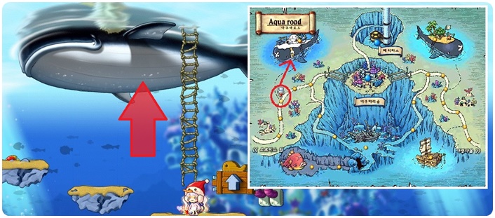 아쿠아리움에서 왼쪽으로 3칸 이동 후 위쪽에 고래섬으로 올라가면 됩니다.