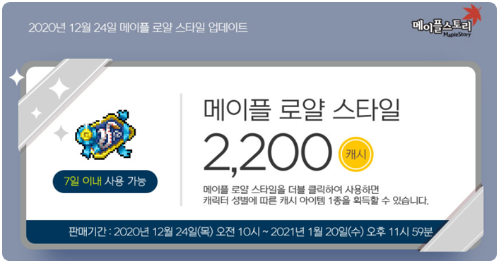 메이플 로얄 스타일은 캐시샵에서 구매가 가능하며 1개에 2200원입니다.