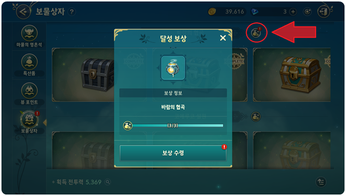 바람의 협곡의 보물상자 달성 보상은 '콜렉팅 아로마'입니다.