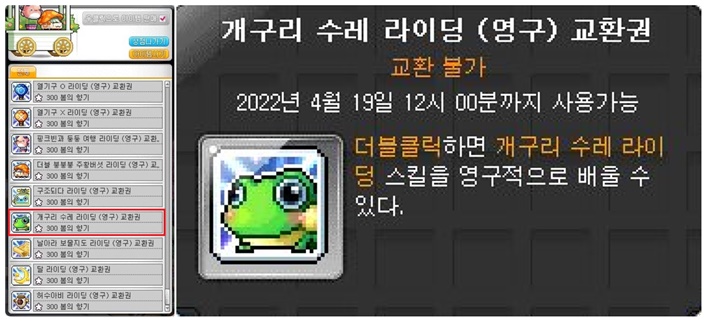 '개구리 수레 라이딩 (영구) 교환권'은 꽃의 향기 300개로 구매할 수 있습니다.