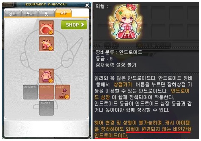 안드로이드를 더블 클릭 시 상점 기능을 이용할 수 있습니다.
