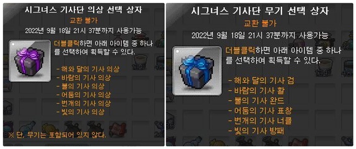 '시그너스 기사단 의상 선택 상자'와 '시그너스 기사단 무기 선택 상자'는