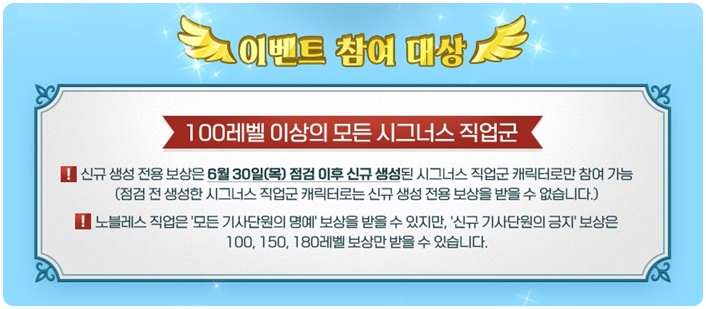 신규 기사단원 보상은 업데이트 이후 생성된 시그너스 캐릭터로 받을 수 있습니다.