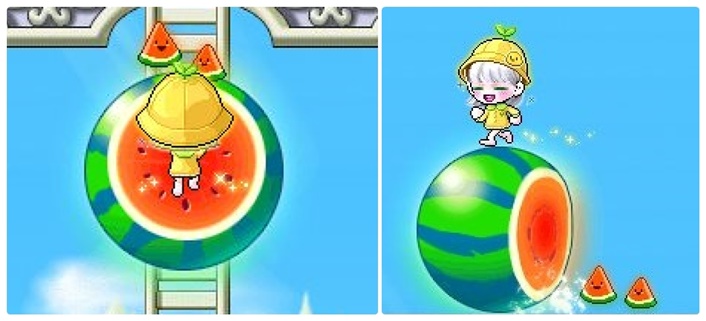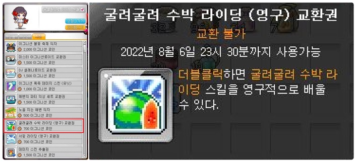 이렇게 메이플스토리 이그니션 코인샵의 굴려굴려 수박 라이딩을 구경해봤습니다.
