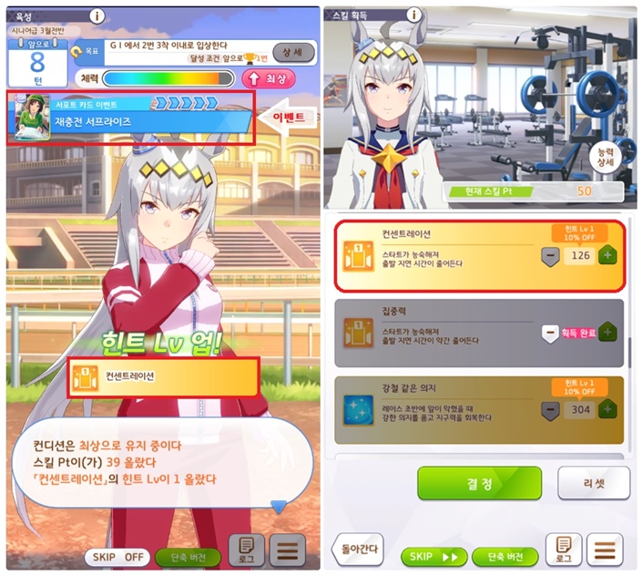 [컨센트레이션] 스킬을 획득하고 1회 육성을 완료하기