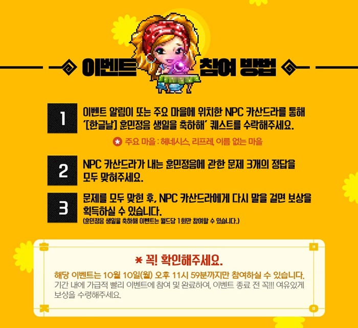 메이플스토리가 2022년 한글날을 기념하여 '훈민정음 생일을 축하해 이벤트'를 진행 중인데요!