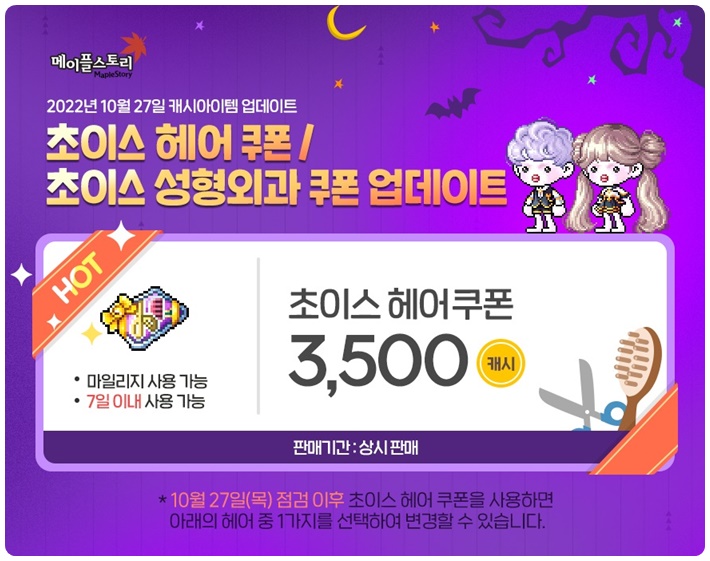 | [메이플스토리] 체인지 헤어 및 성형 쿠폰 업데이트! (+22.10.27) (0) | 2022.10.27 |
