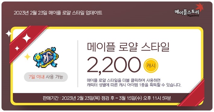 '메이플 로얄 스타일'은 캐시샵에서 구매 가능하며 1개에 2200원입니다.