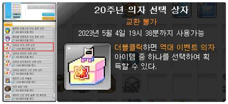 '20주년 의자 선택 상자'는 메이프릴 캔디 1,000개로 구매할 수 있습니다.
