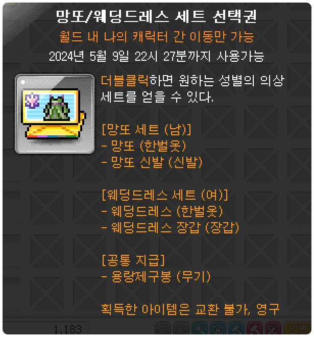 이렇게 메이플스토리 바람의나라 웨딩드레스 세트를 구경해 봤습니다.