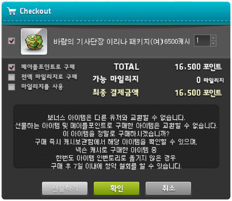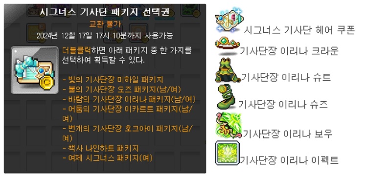이렇게 메이플스토리에 바람의 기사단장 이리나 패키지를 구경해 봤습니다.