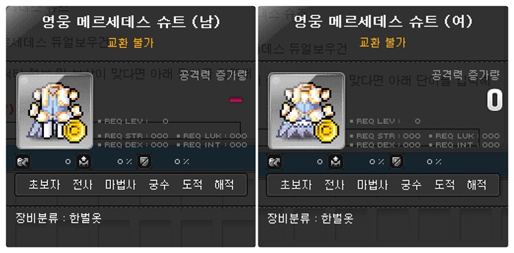 영웅 메르세데스 패키지는 성별에 따라 한벌옷과 신발이 다르며