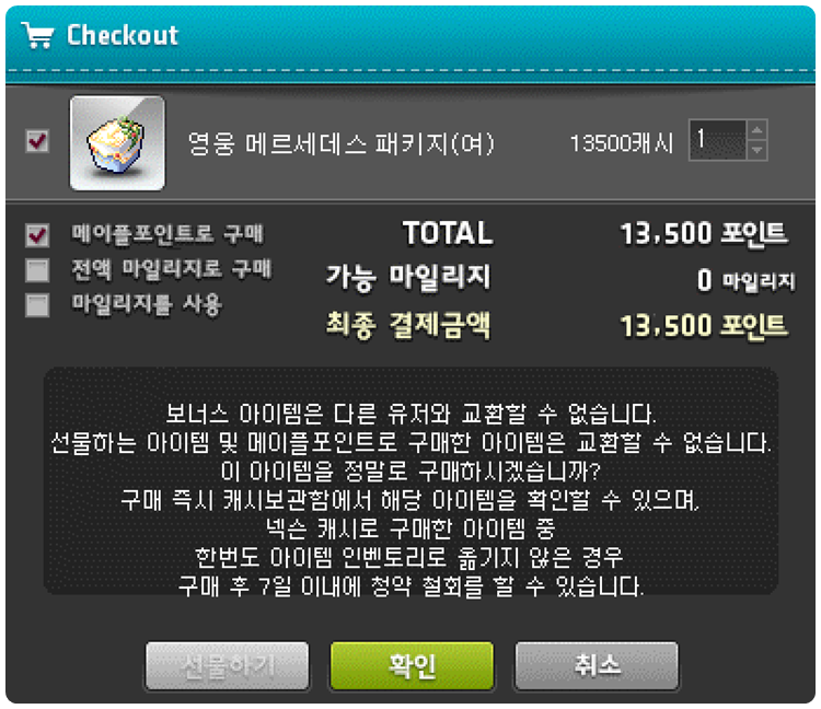 '영웅 메르세데스 패키지' 캐시샵에서 13,500 캐시로 구매할 수 있습니다.