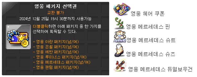 오늘은 메이플스토리의 '영웅 메르세데스 패키지'를 구경해 보겠습니다.