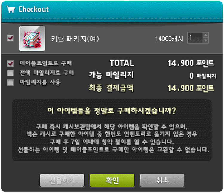 '카링 패키지' 캐시샵에서 14,900 캐시로 구매할 수 있습니다.