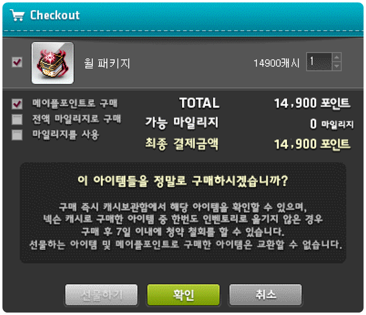 패키지는 캐시 또는 메이플 포인트로 구매할 수 있으며