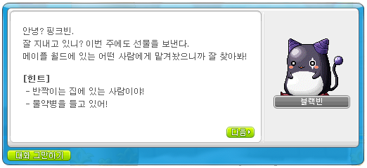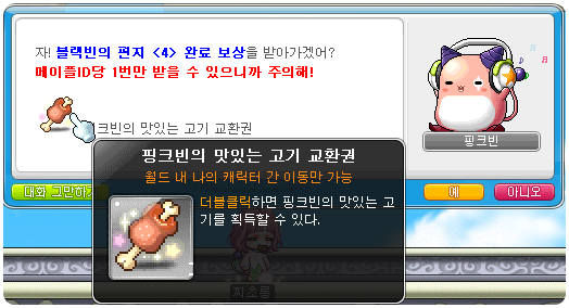 퀘스트는 핑크빈 캐릭터로 접속 후 왼쪽 이벤트 알리미(★)를 통해 받아주시면 됩니다.