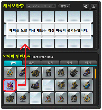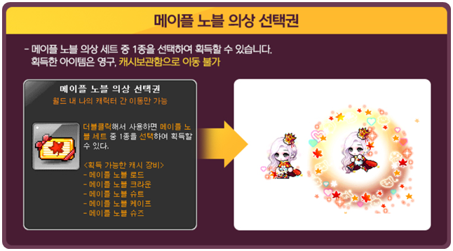 참고로 메이플 노블 의상 세트는 캐시 이동이 불가능합니다.