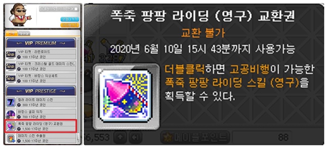 '폭죽 팡팡 라이딩'은 VIP PRESTIGE 등급부터 교환이 가능하며 코인은 1,500개가 필요합니다.