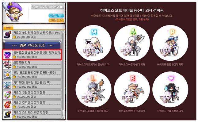 '히어로즈 오브 메이플 등신대 의자'는 VIP PRESTIGE 등급부터 구매가 가능하며 가격은 1억 메소입니다.