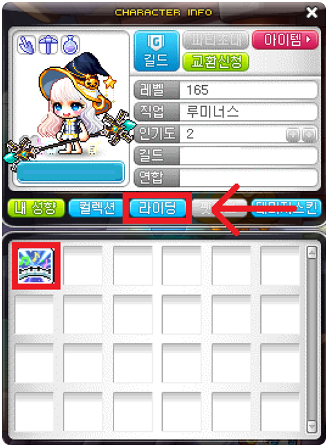 라이딩 사용법은 캐릭터 정보창에서 라이딩을 누른 후 라이딩 스킬을 사용하면 됩니다.