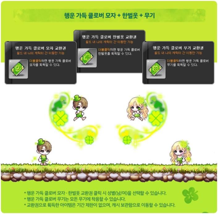 이렇게 메이플스토리 행운 가득 클로버 의상을 구경해봤습니다.
